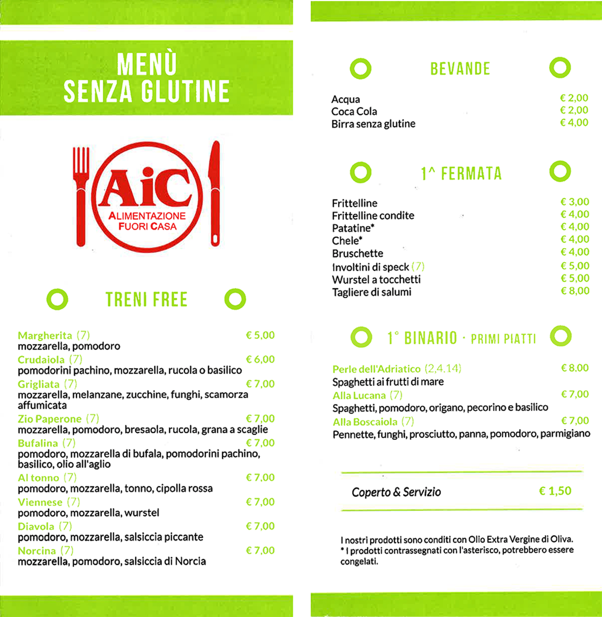 Come ogni ristorante per celiaci, il menu propone una serie di pietanze senza glutine e senza lattosio, riconosciute dall'AIC (Associazione Italiana Celiachia - Alimentazione fuori casa).